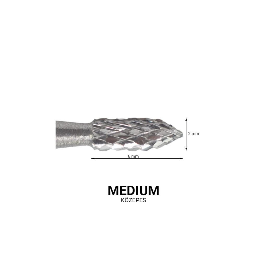 Közepes finomságú, hegyes kúp alakú karbid csiszolófej gépi manikűrözéshez.